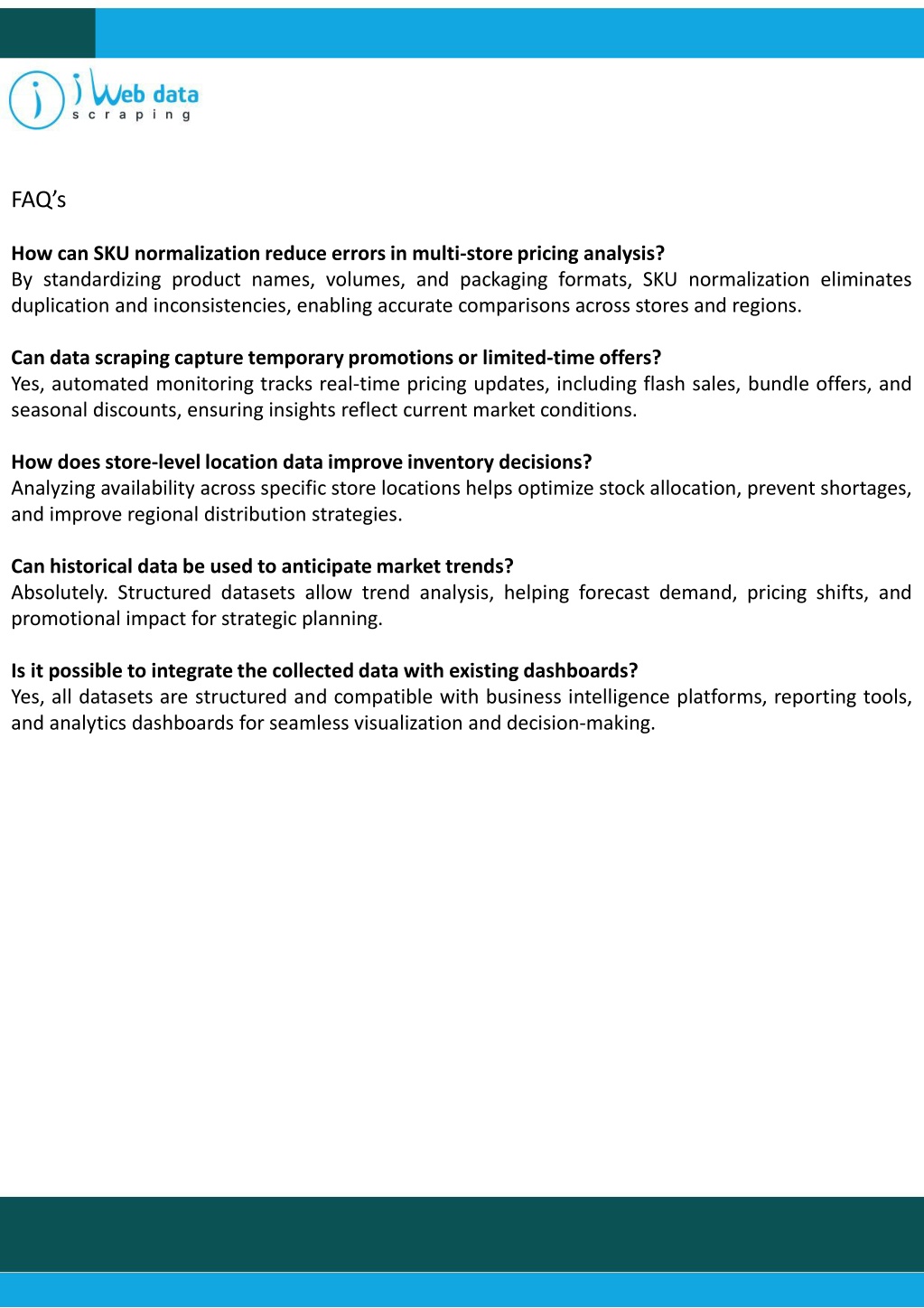 FAQ’s How can SKU normalization reduce errors in multi-store pricing analysis? By standardizing product names, volumes, and packaging formats, SKU normalization eliminates duplication and inconsistencies, enabling accurate comparisons across stores and regions. Can data scraping capture temporary promotions or limited-time offers? Yes, automated monitoring tracks real-time pricing updates, including flash sales, bundle offers, and seasonal discounts, ensuring insights reflect current market conditions. How does store-level location data improve inventory decisions? Analyzing availability across specific store locations helps optimize stock allocation, prevent shortages, and improve regional distribution strategies. Can historical data be used to anticipate market trends? Absolutely. Structured datasets allow trend analysis, helping forecast demand, pricing shifts, and promotional impact for strategic planning. Is it possible to integrate the collected data with existing dashboards? Yes, all datasets are structured and compatible with business intelligence platforms, reporting tools, and analytics dashboards for seamless visualization and decision-making.