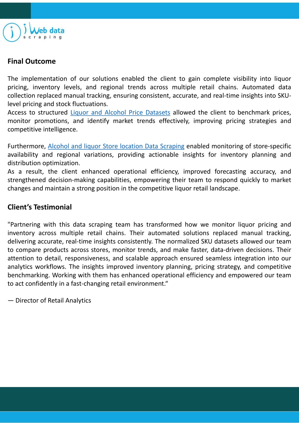 Final Outcome The implementation of our solutions enabled the client to gain complete visibility into liquor pricing, inventory levels, and regional trends across multiple retail chains. Automated data collection replaced manual tracking, ensuring consistent, accurate, and real-time insights into SKU- level pricing and stock fluctuations. Access to structured Liquor and Alcohol Price Datasets allowed the client to benchmark prices, monitor promotions, and identify market trends effectively, improving pricing strategies and competitive intelligence. Furthermore, Alcohol and liquor Store location Data Scraping enabled monitoring of store-specific availability and regional variations, providing actionable insights for inventory planning and distribution optimization. As a result, the client enhanced operational efficiency, improved forecasting accuracy, and strengthened decision-making capabilities, empowering their team to respond quickly to market changes and maintain a strong position in the competitive liquor retail landscape. Client’s Testimonial "Partnering with this data scraping team has transformed how we monitor liquor pricing and inventory across multiple retail chains. Their automated solutions replaced manual tracking, delivering accurate, real-time insights consistently. The normalized SKU datasets allowed our team to compare products across stores, monitor trends, and make faster, data-driven decisions. Their attention to detail, responsiveness, and scalable approach ensured seamless integration into our analytics workflows. The insights improved inventory planning, pricing strategy, and competitive benchmarking. Working with them has enhanced operational efficiency and empowered our team to act confidently in a fast-changing retail environment.“ — Director of Retail Analytics