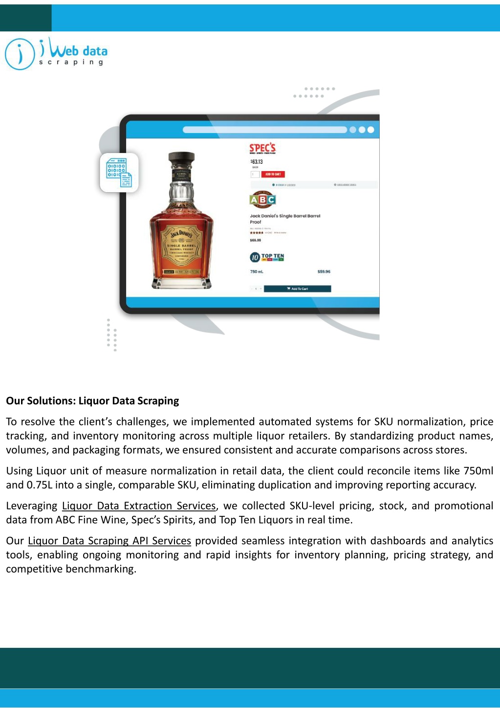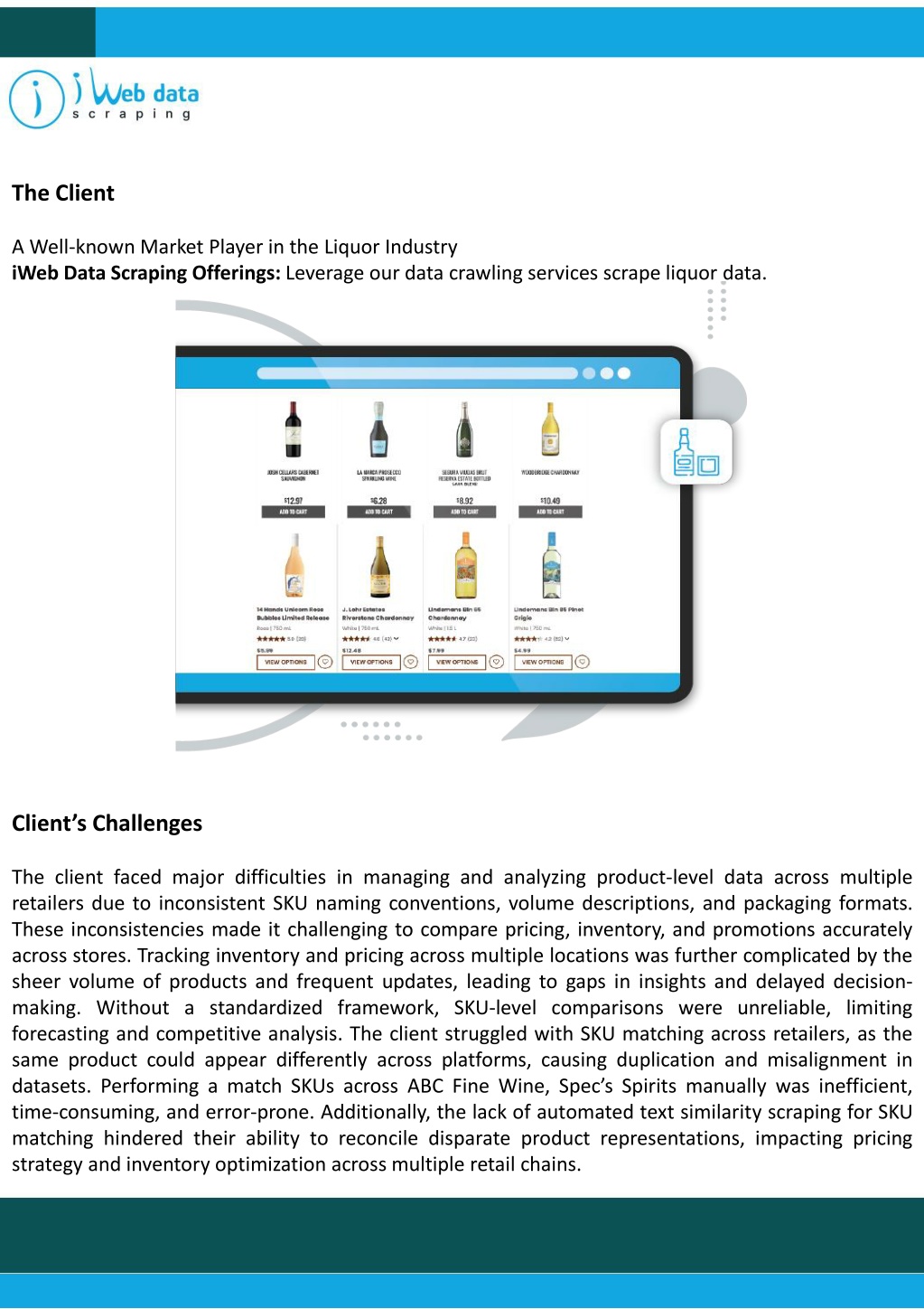 The Client A Well-known Market Player in the Liquor Industry iWeb Data Scraping Offerings: Leverage our data crawling services scrape liquor data. Population Served (Approx.) Store Type Dominant Growth Rate (2023–2025) State / Territory Number of Stores New South Wales 88 7.8 million Urban & Drive-thru +11% Victoria 70 6.6 million Mall & CBD Outlets +9% Queensland 55 5.5 million Suburban Cafes +13% Western Australia 34 2.8 million Standalone Stores +10% South Australia Client’s Challenges 22 1.9 million Mall Cafes +7% Tasmania 8 541,000 Regional Stores +6% Australian Capital Territory The client faced major difficulties in managing and analyzing product-level data across multiple retailers due to inconsistent SKU naming conventions, volume descriptions, and packaging formats. These inconsistencies made it challenging to compare pricing, inventory, and promotions accurately across stores. Tracking inventory and pricing across multiple locations was further complicated by the sheer volume of products and frequent updates, leading to gaps in insights and delayed decision- making. Without a standardized framework, SKU-level comparisons were unreliable, limiting forecasting and competitive analysis. The client struggled with SKU matching across retailers, as the same product could appear differently across platforms, causing duplication and misalignment in datasets. Performing a match SKUs across ABC Fine Wine, Spec’s Spirits manually was inefficient, time-consuming, and error-prone. Additionally, the lack of automated text similarity scraping for SKU matching hindered their ability to reconcile disparate product representations, impacting pricing strategy and inventory optimization across multiple retail chains. 9 462,000 CBD Cafes +5% Northern Territory 5 247,000 Airport Outlets +4%