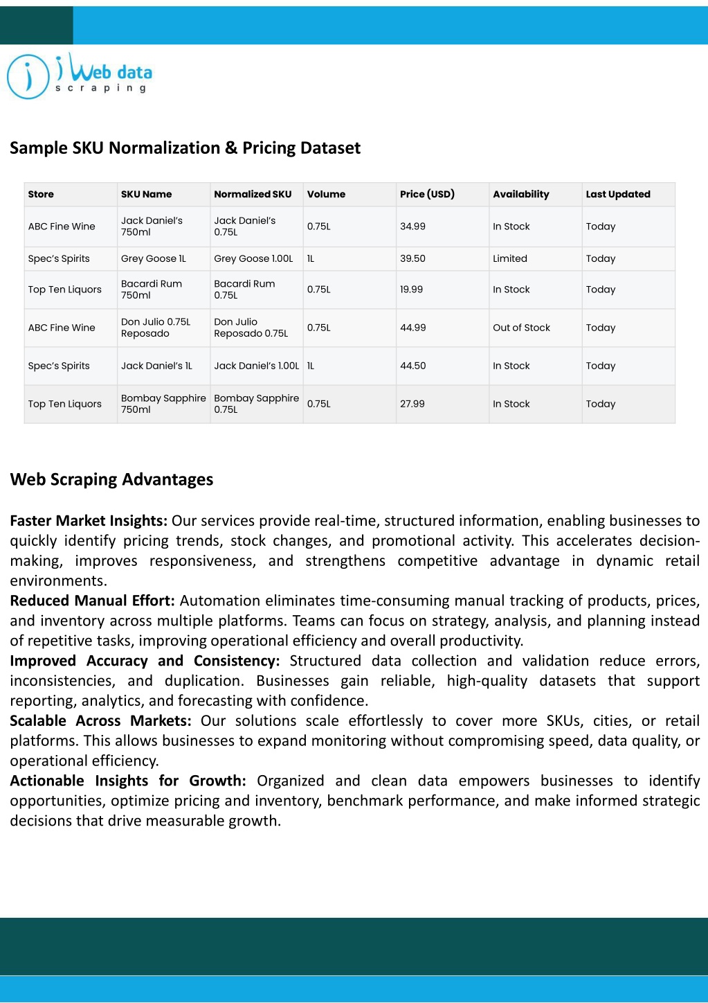 Sample SKU Normalization & Pricing Dataset Store SKU Name Normalized SKU Volume Price (USD) Availability Last Updated Jack Daniel’s 750ml Jack Daniel’s 0.75L ABC Fine Wine 0.75L 34.99 In Stock Today Spec’s Spirits Grey Goose 1L Grey Goose 1.00L 1L 39.50 Limited Today Bacardi Rum 750ml Bacardi Rum 0.75L Top Ten Liquors 0.75L 19.99 In Stock Today Don Julio 0.75L Reposado Don Julio Reposado 0.75L ABC Fine Wine 0.75L 44.99 Out of Stock Today Spec’s Spirits Jack Daniel’s 1L Jack Daniel’s 1.00L 1L 44.50 In Stock Today Bombay Sapphire 750ml Bombay Sapphire 0.75L Top Ten Liquors 0.75L 27.99 In Stock Today Web Scraping Advantages Faster Market Insights: Our services provide real-time, structured information, enabling businesses to quickly identify pricing trends, stock changes, and promotional activity. This accelerates decision- making, improves responsiveness, and strengthens competitive advantage in dynamic retail environments. Reduced Manual Effort: Automation eliminates time-consuming manual tracking of products, prices, and inventory across multiple platforms. Teams can focus on strategy, analysis, and planning instead of repetitive tasks, improving operational efficiency and overall productivity. Improved Accuracy and Consistency: Structured data collection and validation reduce errors, inconsistencies, and duplication. Businesses gain reliable, high-quality datasets that support reporting, analytics, and forecasting with confidence. Scalable Across Markets: Our solutions scale effortlessly to cover more SKUs, cities, or retail platforms. This allows businesses to expand monitoring without compromising speed, data quality, or operational efficiency. Actionable Insights for Growth: Organized and clean data empowers businesses to identify opportunities, optimize pricing and inventory, benchmark performance, and make informed strategic decisions that drive measurable growth.