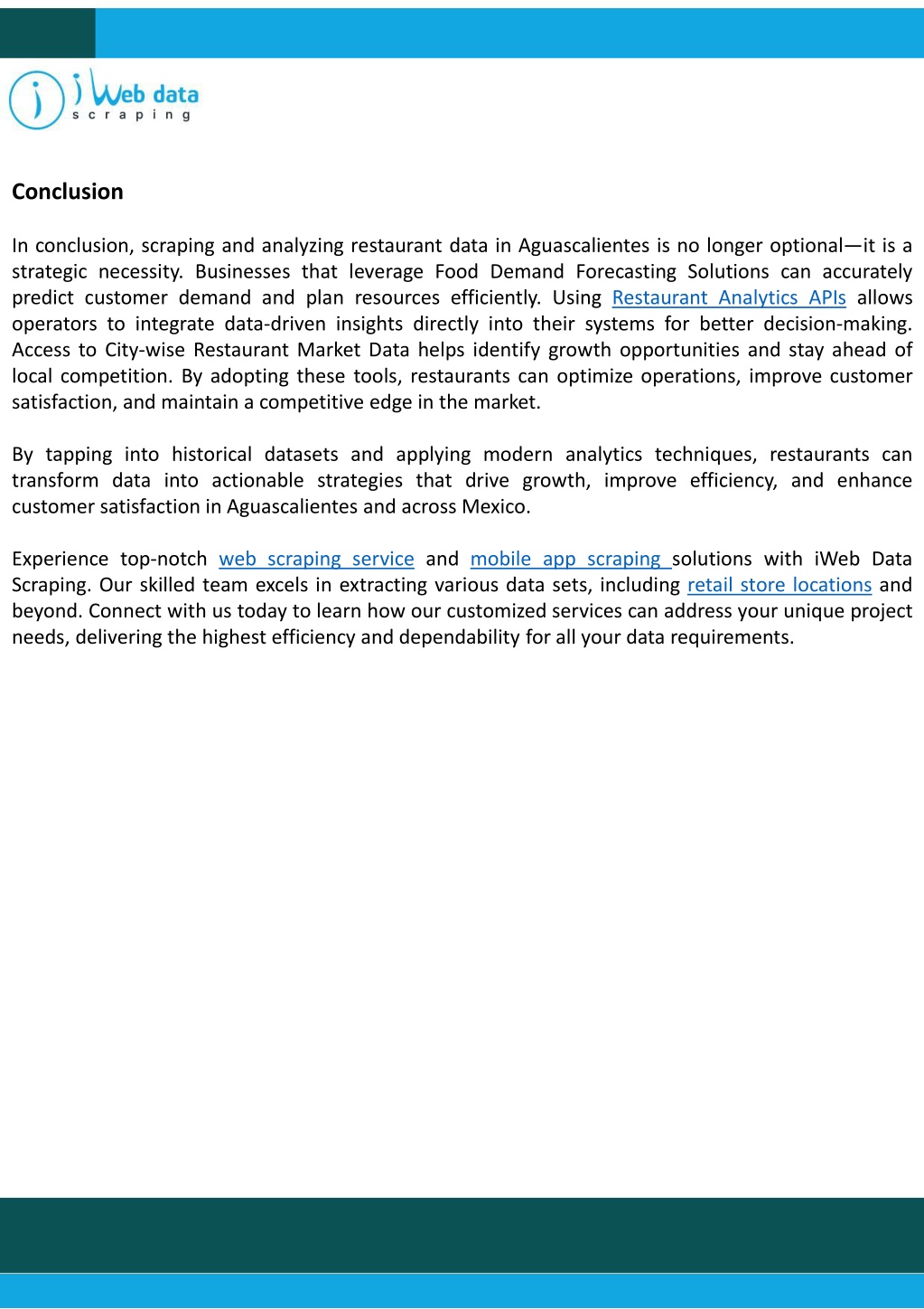 Conclusion In conclusion, scraping and analyzing restaurant data in Aguascalientes is no longer optional—it is a strategic necessity. Businesses that leverage Food Demand Forecasting Solutions can accurately predict customer demand and plan resources efficiently. Using Restaurant Analytics APIs allows operators to integrate data-driven insights directly into their systems for better decision-making. Access to City-wise Restaurant Market Data helps identify growth opportunities and stay ahead of local competition. By adopting these tools, restaurants can optimize operations, improve customer satisfaction, and maintain a competitive edge in the market. By tapping into historical datasets and applying modern analytics techniques, restaurants can transform data into actionable strategies that drive growth, improve efficiency, and enhance customer satisfaction in Aguascalientes and across Mexico. Experience top-notch web scraping service and mobile app scraping solutions with iWeb Data Scraping. Our skilled team excels in extracting various data sets, including retail store locations and beyond. Connect with us today to learn how our customized services can address your unique project needs, delivering the highest efficiency and dependability for all your data requirements.