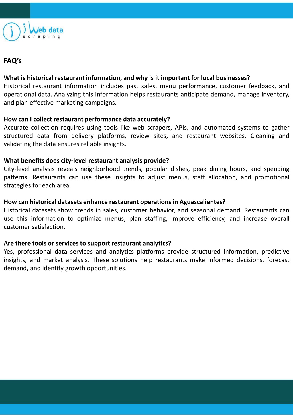 FAQ’s What is historical restaurant information, and why is it important for local businesses? Historical restaurant information includes past sales, menu performance, customer feedback, and operational data. Analyzing this information helps restaurants anticipate demand, manage inventory, and plan effective marketing campaigns. How can I collect restaurant performance data accurately? Accurate collection requires using tools like web scrapers, APIs, and automated systems to gather structured data from delivery platforms, review sites, and restaurant websites. Cleaning and validating the data ensures reliable insights. What benefits does city-level restaurant analysis provide? City-level analysis reveals neighborhood trends, popular dishes, peak dining hours, and spending patterns. Restaurants can use these insights to adjust menus, staff allocation, and promotional strategies for each area. How can historical datasets enhance restaurant operations in Aguascalientes? Historical datasets show trends in sales, customer behavior, and seasonal demand. Restaurants can use this information to optimize menus, plan staffing, improve efficiency, and increase overall customer satisfaction. Are there tools or services to support restaurant analytics? Yes, professional data services and analytics platforms provide structured information, predictive insights, and market analysis. These solutions help restaurants make informed decisions, forecast demand, and identify growth opportunities.