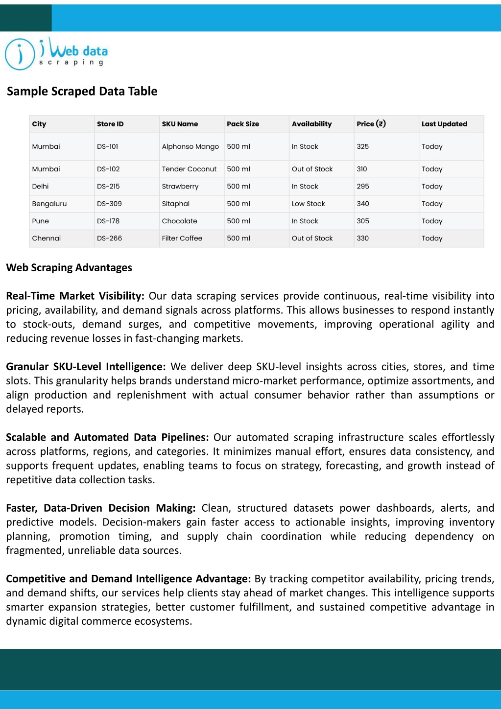Sample Scraped Data Table Web Scraping Advantages Real-Time Market Visibility: Our data scraping services provide continuous, real-time visibility into pricing, availability, and demand signals across platforms. This allows businesses to respond instantly to stock-outs, demand surges, and competitive movements, improving operational agility and reducing revenue losses in fast-changing markets. Granular SKU-Level Intelligence: We deliver deep SKU-level insights across cities, stores, and time slots. This granularity helps brands understand micro-market performance, optimize assortments, and align production and replenishment with actual consumer behavior rather than assumptions or delayed reports. Scalable and Automated Data Pipelines: Our automated scraping infrastructure scales effortlessly across platforms, regions, and categories. It minimizes manual effort, ensures data consistency, and supports frequent updates, enabling teams to focus on strategy, forecasting, and growth instead of repetitive data collection tasks. Faster, Data-Driven Decision Making: Clean, structured datasets power dashboards, alerts, and predictive models. Decision-makers gain faster access to actionable insights, improving inventory planning, promotion timing, and supply chain coordination while reducing dependency on fragmented, unreliable data sources. Competitive and Demand Intelligence Advantage: By tracking competitor availability, pricing trends, and demand shifts, our services help clients stay ahead of market changes. This intelligence supports smarter expansion strategies, better customer fulfillment, and sustained competitive advantage in dynamic digital commerce ecosystems.