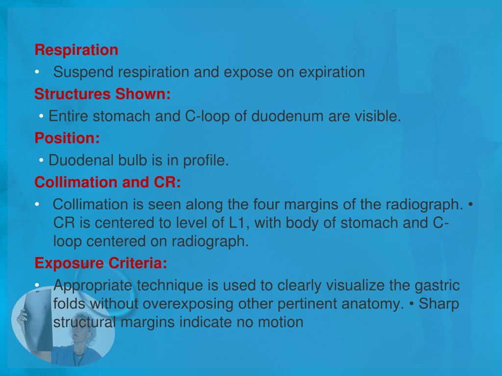 Respiration • Suspend respiration and expose on expiration Structures Shown: • Entire stomach and C-loop of duodenum are visible. Position: • Duodenal bulb is in profile. Collimation and CR: • Collimation is seen along the four margins of the radiograph. • CR is centered to level of L1, with body of stomach and C-loop centered on radiograph. Exposure Criteria: • Appropriate technique is used to clearly visualize the gastric folds without overexposing other pertinent anatomy. • Sharp structural margins indicate no motion