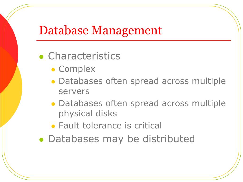 Database Management • Characteristics • Complex • Databases often spread across multiple servers • Databases often spread across multiple physical disks • Fault tolerance is critical • Databases may be distributed