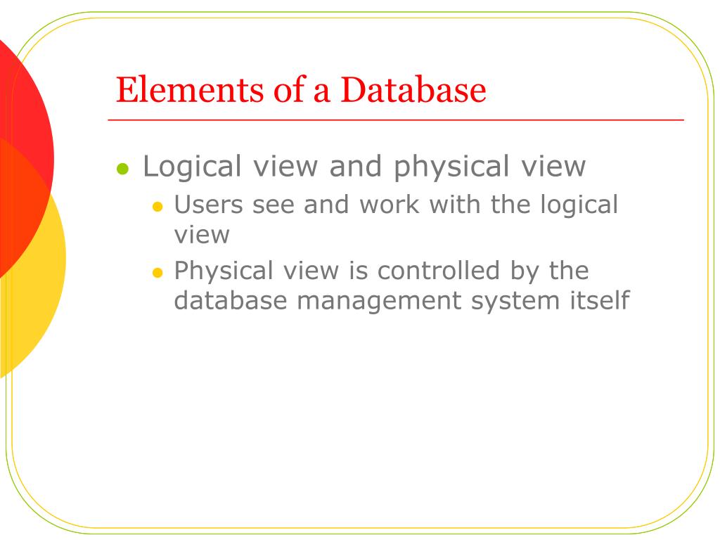 Elements of a Database • Logical view and physical view • Users see and work with the logical view • Physical view is controlled by the database management system itself