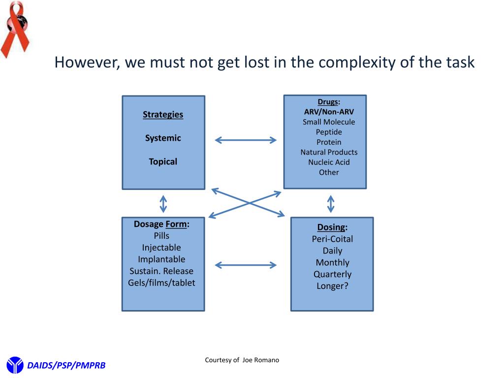 However, we must not get lost in the complexity of the task Drugs: ARV/Non-ARV Small Molecule Peptide Protein Natural Products Nucleic Acid Other Strategies Systemic Topical Dosage Form: Pills Injectable Implantable Sustain. Release Gels/films/tablet Dosing: Peri-Coital Daily Monthly Quarterly Longer? Courtesy of Joe Romano DAIDS/PSP/PMPRB