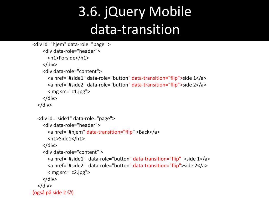 3.6. jQuery Mobile data-transition <div id="hjem" data-role="page" > <div data-role="header"> <h1>Forside</h1> </div> <div data-role="content"> <a href="#side1" data-role="button" data-transition="flip">side 1</a> <a href="#side2" data-role="button" data-transition="flip">side 2</a> <imgsrc="c1.jpg"> </div> </div> <div id="side1" data-role="page"> <div data-role="header"> <a href="#hjem"data-transition="flip" >Back</a> <h1>Side1</h1> </div> <div data-role="content” > <a href="#side1" data-role="button" data-transition="flip" >side 1</a> <a href="#side2" data-role="button" data-transition="flip">side 2</a> <imgsrc="c2.jpg"> </div> </div> (også på side 2 )