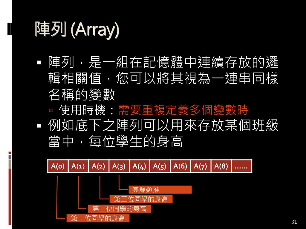陣列 (Array) • 陣列,是一組在記憶體中連續存放的邏輯相關值,您可以將其視為一連串同樣名稱的變數 • 使用時機:需要重複定義多個變數時 • 例如底下之陣列可以用來存放某個班級當中,每位學生的身高 其餘類推 第三位同學的身高 第二位同學的身高 第一位同學的身高