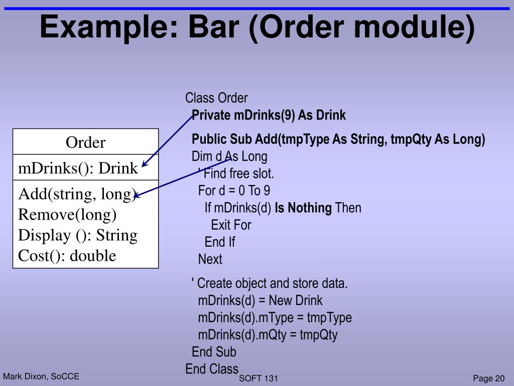Example: Bar (Order module) Order mDrinks(): Drink Add(string, long) Remove(long) Display (): String Cost(): double Class Order Private mDrinks(9) As Drink Public Sub Add(tmpType As String, tmpQty As Long) Dim d As Long ' Find free slot. For d = 0 To 9 If mDrinks(d) Is Nothing Then Exit For End If Next ' Create object and store data. mDrinks(d) = New Drink mDrinks(d).mType = tmpType mDrinks(d).mQty = tmpQty End Sub End Class