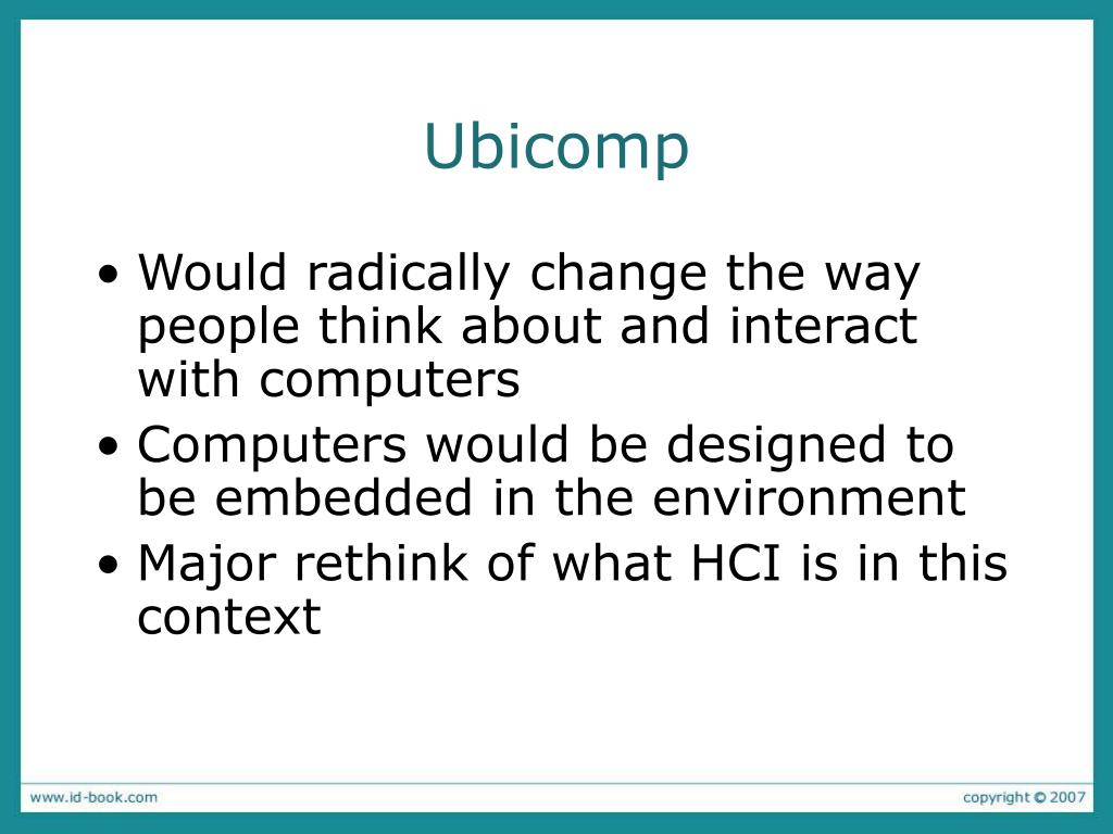 Ubicomp • Would radically change the way people think about and interact with computers • Computers would be designed to be embedded in the environment • Major rethink of what HCI is in this context