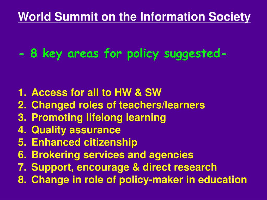 World Summit on the Information Society • - 8 key areas for policy suggested- • Access for all to HW & SW • Changed roles of teachers/learners • Promoting lifelong learning • Quality assurance • Enhanced citizenship • Brokering services and agencies • Support, encourage & direct research • Change in role of policy-maker in education