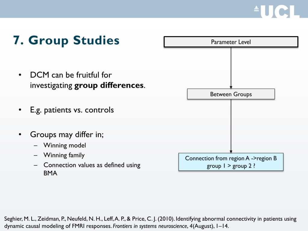 7. Group Studies Parameter Level Between Groups • DCM can be fruitful for investigating group differences. • E.g. patients vs. controls • Groups may differ in; • Winning model • Winning family • Connection values as defined using BMA Connection from region A ->region B group 1 > group 2 ? Seghier, M. L., Zeidman, P., Neufeld, N. H., Leff, A. P., & Price, C. J. (2010). Identifying abnormal connectivity in patients using dynamic causal modeling of FMRI responses. Frontiers in systems neuroscience, 4(August), 1–14.