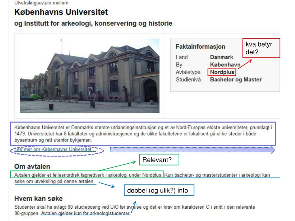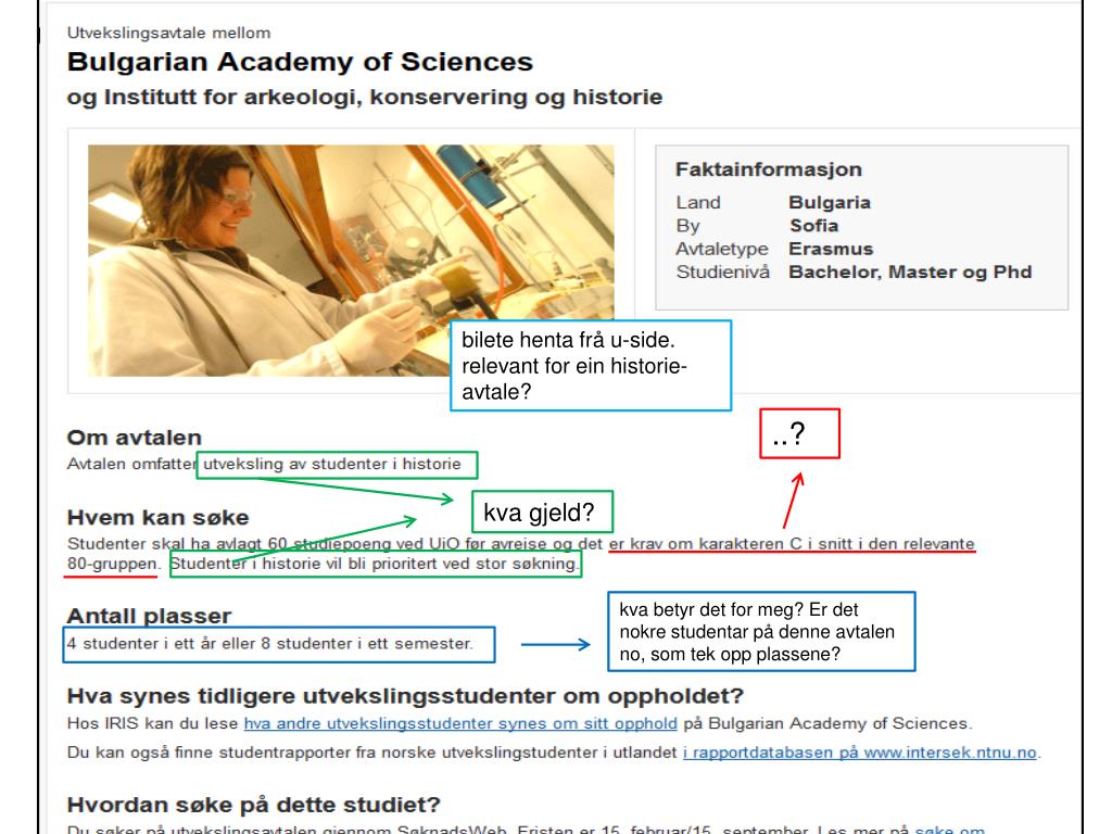 Bra i dag • Vilje til å hjelpe studentane • Mykje bra innhald mange stader, på avtalar, programsider og Om utveksling-sider sentralt og lokalt • men varierande = forvirrande