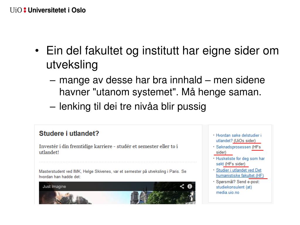 Ein del fakultet og institutt har eigne sider om utveksling • mange av desse har bra innhald – men sidene havner "utanom systemet". Må henge saman. • lenking til dei tre nivåa blir pussig