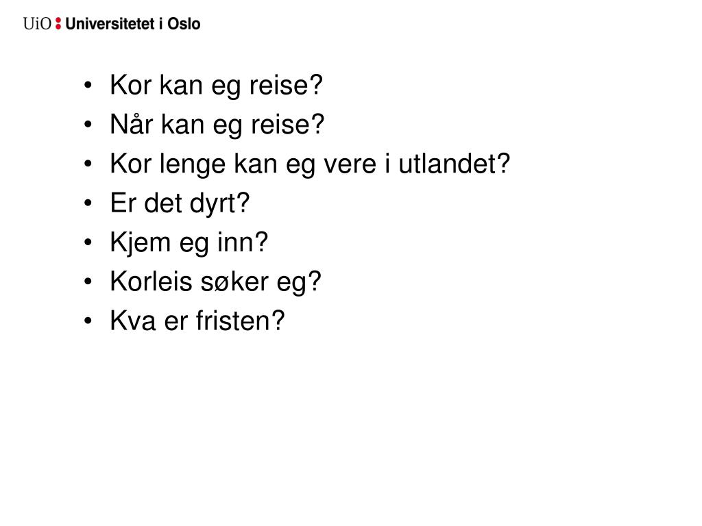 Kor kan eg reise? • Når kan eg reise? • Kor lenge kan egvere i utlandet? • Er det dyrt? • Kjem eg inn? • Korleis søker eg? • Kva er fristen?