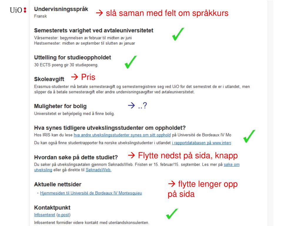 Forslag • Delstudier i utlandet Utveksling • Anbefalte avtalar inn i programsidemal • Ny mal for avtalesider • Fjerne universitetssider • Fjerne duplisert innhald på ulike nivå • Innhaldsgjennomgang sentralt og lokalt • Fleirefellestekstar / eksempeltekstar