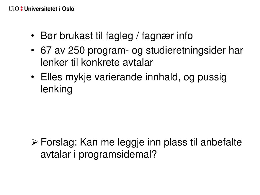 Bør brukast til fagleg / fagnær info • 67 av 250 program- og studieretningsider har lenker til konkrete avtalar • Elles mykjevarierandeinnhald, og pussig lenking • Forslag: Kan meleggje inn plass til anbefalte avtalar i programsidemal?