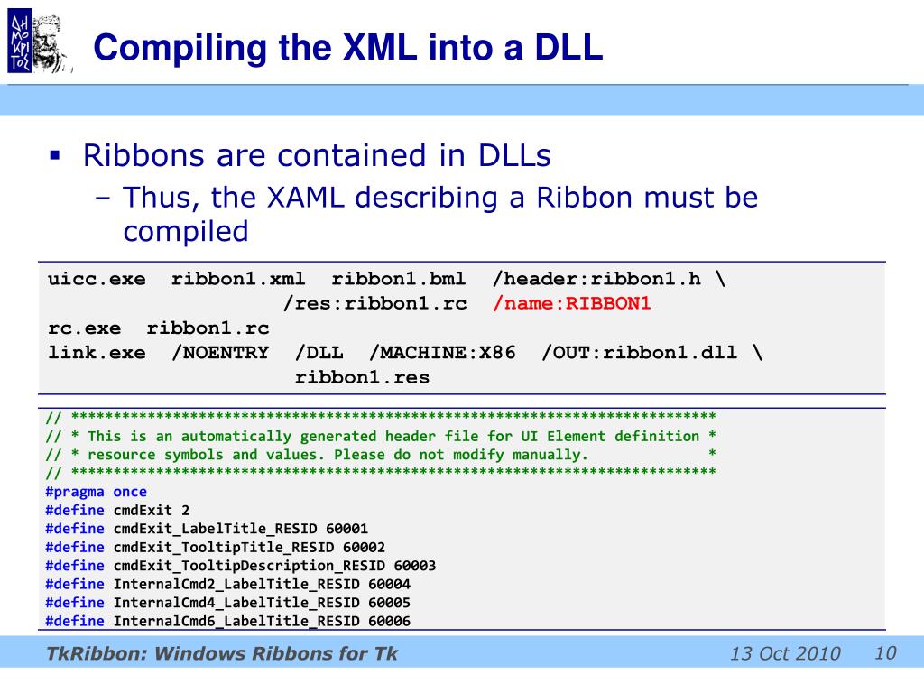 Compiling the XML into a DLL • Ribbons are contained in DLLs • Thus, the XAML describing a Ribbon must be compiled TkRibbon: Windows Ribbons for Tk
