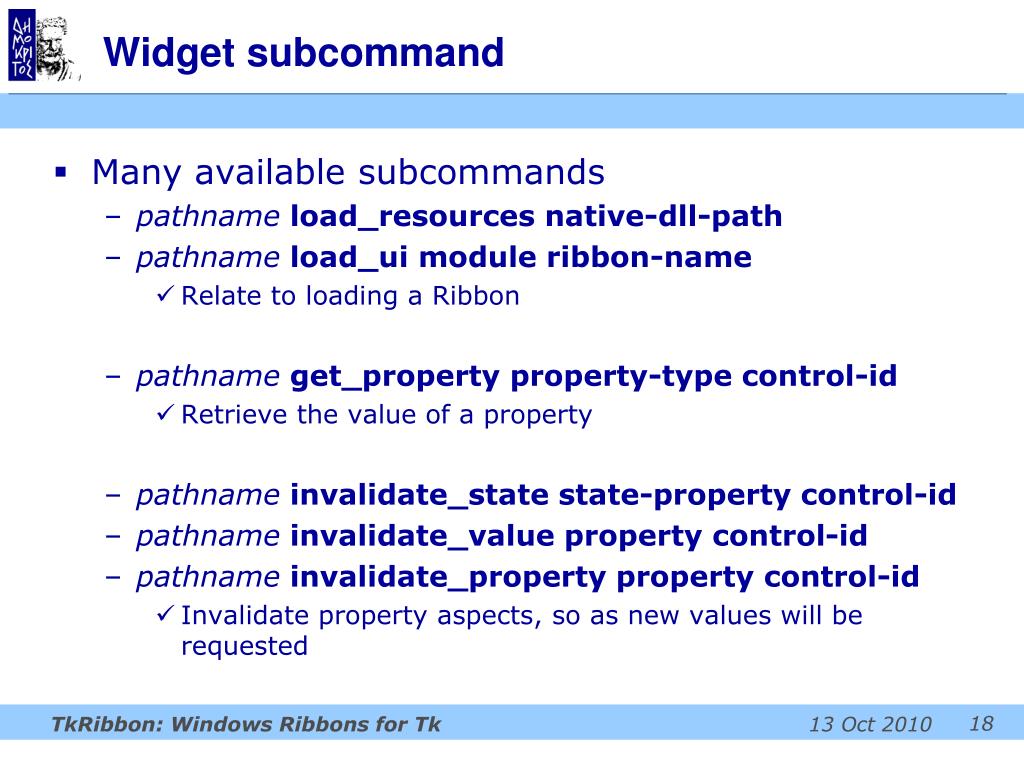 Widget subcommand • Many available subcommands • pathnameload_resources native-dll-path • pathnameload_ui module ribbon-name • Relate to loading a Ribbon • pathnameget_property property-type control-id • Retrieve the value of a property • pathnameinvalidate_state state-property control-id • pathnameinvalidate_value property control-id • pathnameinvalidate_property property control-id • Invalidate property aspects, so as new values will be requested TkRibbon: Windows Ribbons for Tk