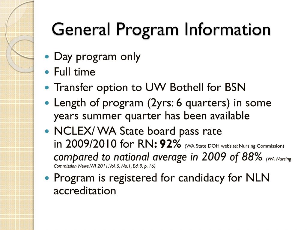 General Program Information • Day program only • Full time • Transfer option to UW Bothell for BSN • Length of program (2yrs: 6 quarters) in some years summer quarter has been available • NCLEX/ WA State board pass ratein 2009/2010 for RN: 92% (WA State DOH website: Nursing Commission)compared to national average in 2009 of 88% (WA Nursing Commission News, WI 2011, Vol. 5, No.1, Ed. 9, p. 16) • Program is registered for candidacy for NLN accreditation