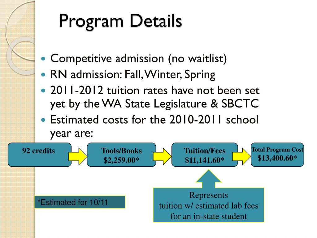 Program Details • Competitive admission (no waitlist) • RN admission: Fall, Winter, Spring • 2011-2012 tuition rates have not been set yet by the WA State Legislature & SBCTC • Estimated costs for the 2010-2011 school year are: 92 credits Tools/Books $2,259.00* Tuition/Fees $11,141.60* Total Program Cost $13,400.60* Represents tuition w/ estimated lab fees for an in-state student *Estimated for 10/11