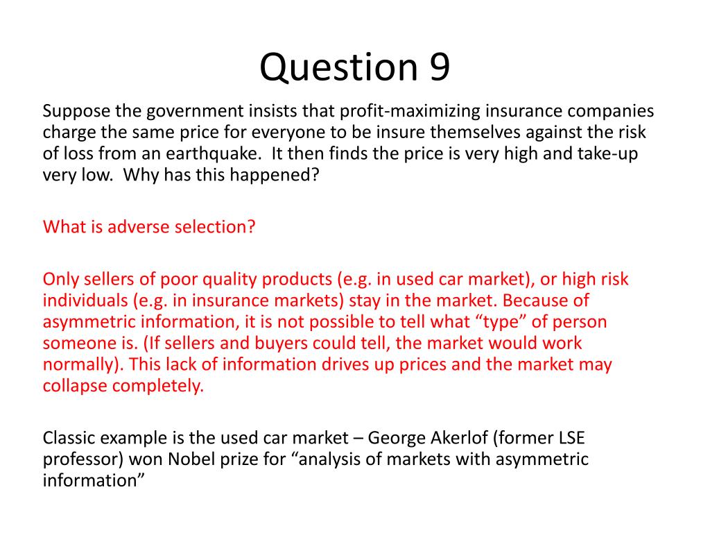 Question 9 Suppose the government insists that profit-maximizing insurance companies charge the same price for everyone to be insure themselves against the risk of loss from an earthquake. It then finds the price is very high and take-up very low. Why has this happened? What is adverse selection? Only sellers of poor quality products (e.g. in used car market), or high risk individuals (e.g. in insurance markets) stay in the market. Because of asymmetric information, it is not possible to tell what “type” of person someone is. (If sellers and buyers could tell, the market would work normally). This lack of information drives up prices and the market may collapse completely. Classic example is the used car market – George Akerlof (former LSE professor) won Nobel prize for “analysis of markets with asymmetric information”