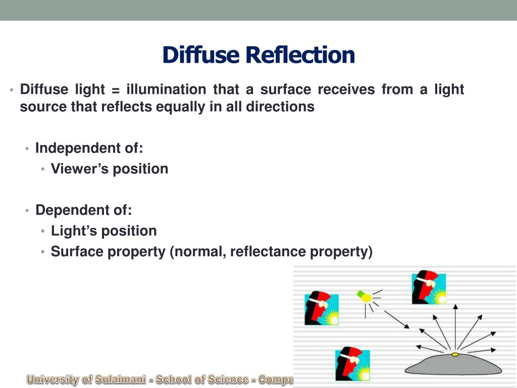 University of Sulaimani - School of Science - Computer Dept. Diffuse Reflection • Diffuse light = illumination that a surface receives from a light source that reflects equally in all directions • Independent of: • Viewer’s position • Dependent of: • Light’s position • Surface property (normal, reflectance property)