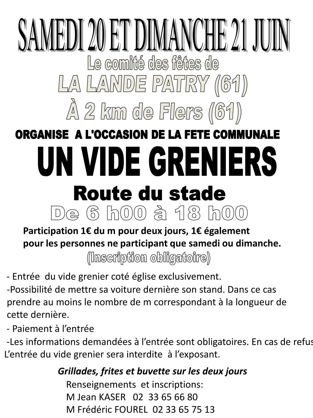 SAMEDI 20 ET DIMANCHE 21 JUIN Le comité des fêtes de LA LANDE PATRY (61) À 2 km de Flers (61) ORGANISE A L'OCCASION DE LA FETE COMMUNALE UN VIDE GRENIERS Route du stade De 6 h00 à 18 h00 Participation 1€ du m pour deux jours, 1€ également pour les personnes ne participant que samedi ou dimanche. (Inscription obligatoire) - Entrée du vide grenier coté église exclusivement. -Possibilité de mettre sa voiture dernière son stand. Dans ce cas prendre au moins le nombre de m correspondant à la longueur de cette dernière. - Paiement à l’entrée -Les informations demandées à l’entrée sont obligatoires. En cas de refus L’entrée du vide grenier sera interdite à l’exposant. Grillades, frites et buvette sur les deux jours Renseignements et inscriptions: M Jean KASER 02 33 65 66 80 M Frédéric FOUREL 02 33 65 75 13