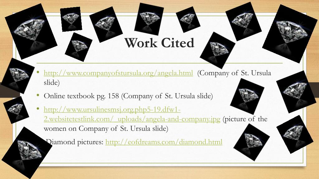Work Cited • http://www.companyofstursula.org/angela.html (Company of St. Ursula slide) • Online textbook pg. 158 (Company of St. Ursula slide) • http://www.ursulinesmsj.org.php5-19.dfw1-2.websitetestlink.com/_uploads/angela-and-company.jpg (picture of the women on Company of St. Ursula slide) • Diamond pictures: http://eofdreams.com/diamond.html