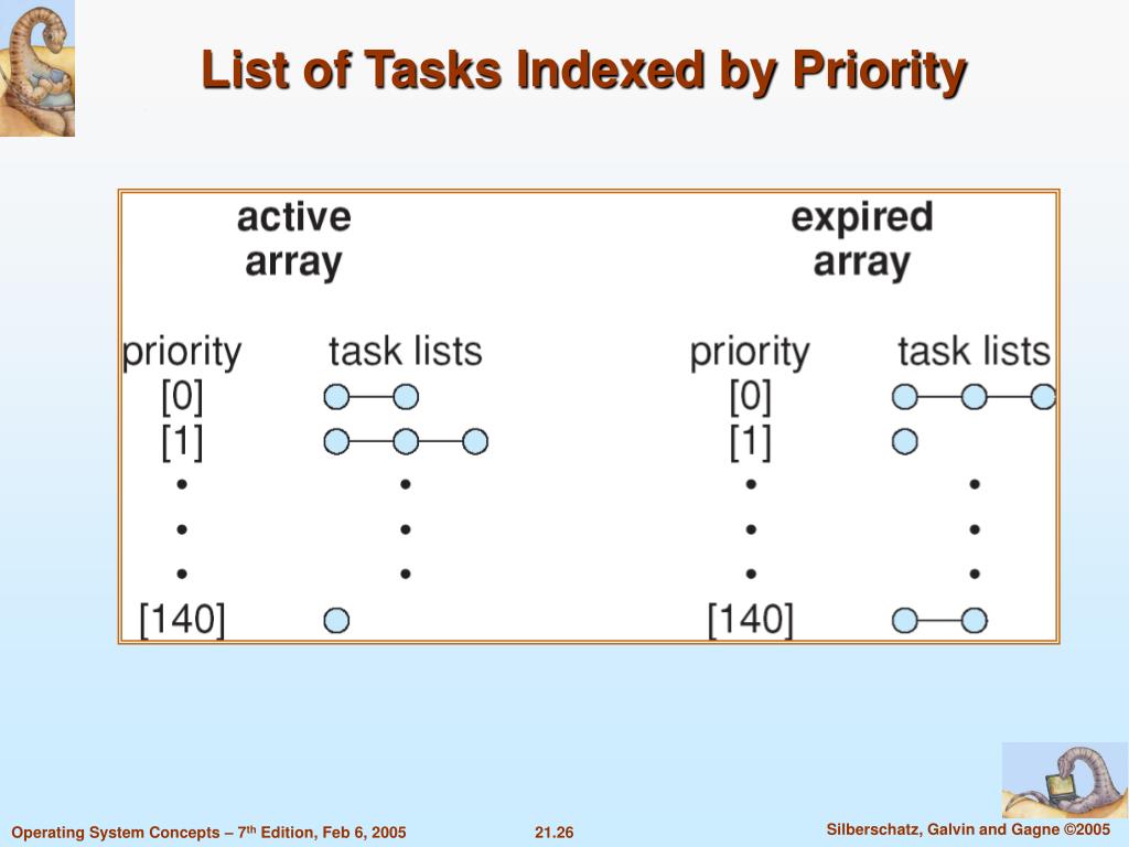 Process Scheduling (Cont.) • Linux implements the FIFO and round-robin real-time scheduling classes; in both cases, each process has a priority in addition to its scheduling class • The scheduler runs the process with the highest priority; for equal-priority processes, it runs the process waiting the longest • FIFO processes continue to run until they either exit or block • A round-robin process will be preempted after a while and moved to the end of the scheduling queue, so that round-robing processes of equal priority automatically time-share between themselves