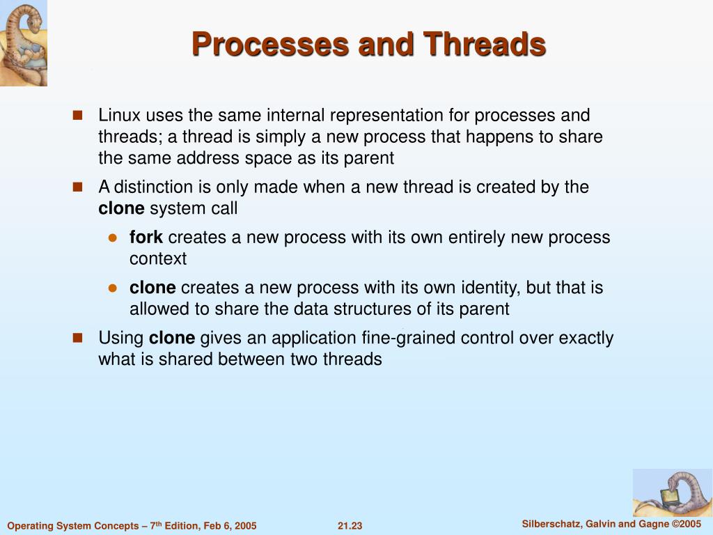 Processes and Threads • Linux uses the same internal representation for processes and threads; a thread is simply a new process that happens to share the same address space as its parent • A distinction is only made when a new thread is created by the clone system call • fork creates a new process with its own entirely new process context • clone creates a new process with its own identity, but that is allowed to share the data structures of its parent • Using clone gives an application fine-grained control over exactly what is shared between two threads