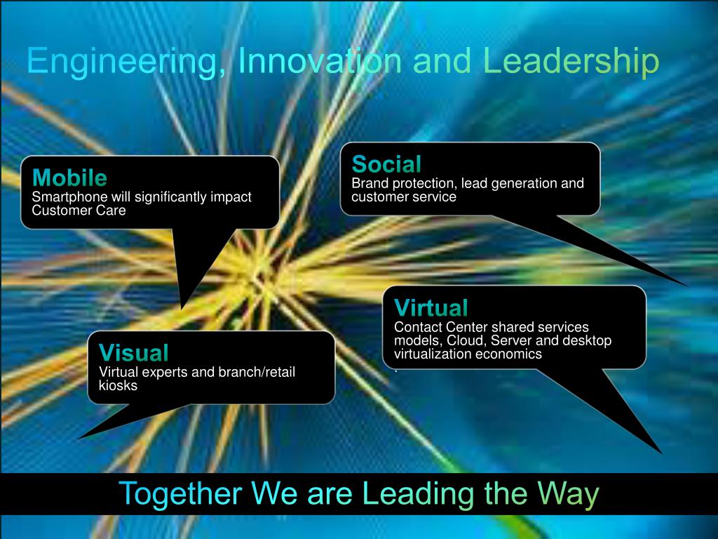 Engineering, Innovation and Leadership Social Brand protection, lead generation and customer service Mobile Smartphone will significantly impact Customer Care Virtual Contact Center shared services models, Cloud, Server and desktop virtualization economics . Visual Virtual experts and branch/retail kiosks Together We are Leading the Way