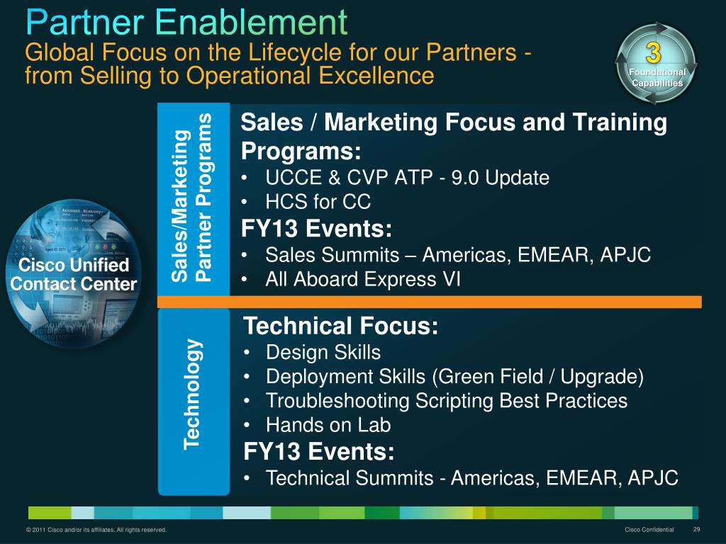 Partner EnablementGlobal Focus on the Lifecycle for our Partners - from Selling to Operational Excellence • Sales / Marketing Focusand Training • Programs: • UCCE & CVP ATP - 9.0 Update • HCS for CC • FY13 Events: • Sales Summits – Americas, EMEAR, APJC • All Aboard Express VI Sales/Marketing Partner Programs 3 Foundational Capabilities • Technical Focus: • Design Skills • Deployment Skills (Green Field / Upgrade) • Troubleshooting Scripting Best Practices • Hands on Lab • FY13 Events: • Technical Summits - Americas, EMEAR, APJC Technology