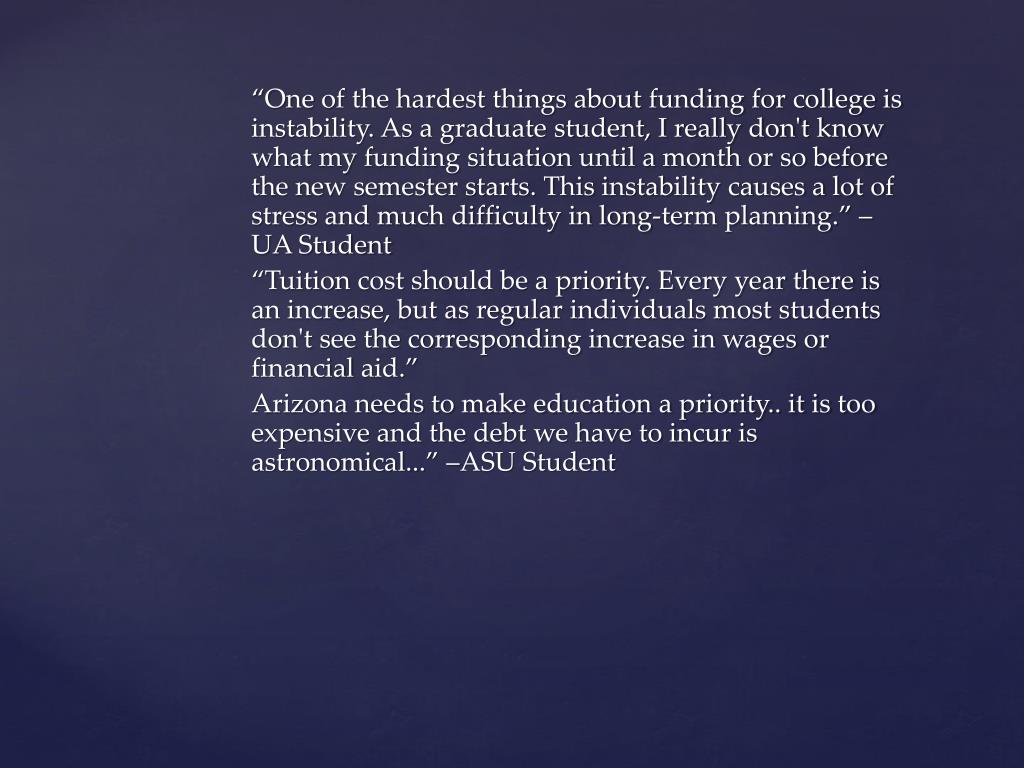 “One of the hardest things about funding for college is instability. As a graduate student, I really don't know what my funding situation until a month or so before the new semester starts. This instability causes a lot of stress and much difficulty in long-term planning.” –UA Student “Tuition cost should be a priority. Every year there is an increase, but as regular individuals most students don't see the corresponding increase in wages or financial aid.” Arizona needs to make education a priority.. it is too expensive and the debt we have to incur is astronomical...” –ASU Student