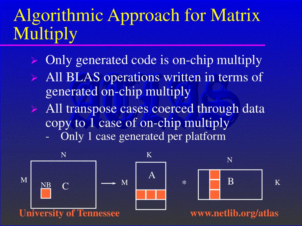 N K N A M B M K * NB C Algorithmic Approach for Matrix Multiply • Only generated code is on-chip multiply • All BLAS operations written in terms of generated on-chip multiply • All transpose cases coerced through data copy to 1 case of on-chip multiply • Only 1 case generated per platform