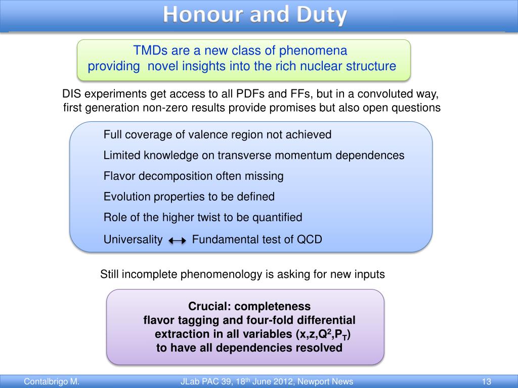 Honour and Duty TMDs are a new class of phenomena providing novel insights into the rich nuclear structure DIS experiments get access to all PDFs and FFs, but in a convoluted way, first generation non-zero resultsprovide promises but also open questions Full coverage of valence region not achieved Limited knowledge on transverse momentum dependences Flavor decomposition often missing Evolution properties to be defined Role of the higher twist to be quantified UniversalityFundamental test of QCD Still incomplete phenomenology is asking for new inputs Crucial: completeness flavor tagging and four-fold differential extraction in all variables (x,z,Q2,PT) to have all dependencies resolved JLab PAC 39, 18th June 2012, Newport News Contalbrigo M. 13