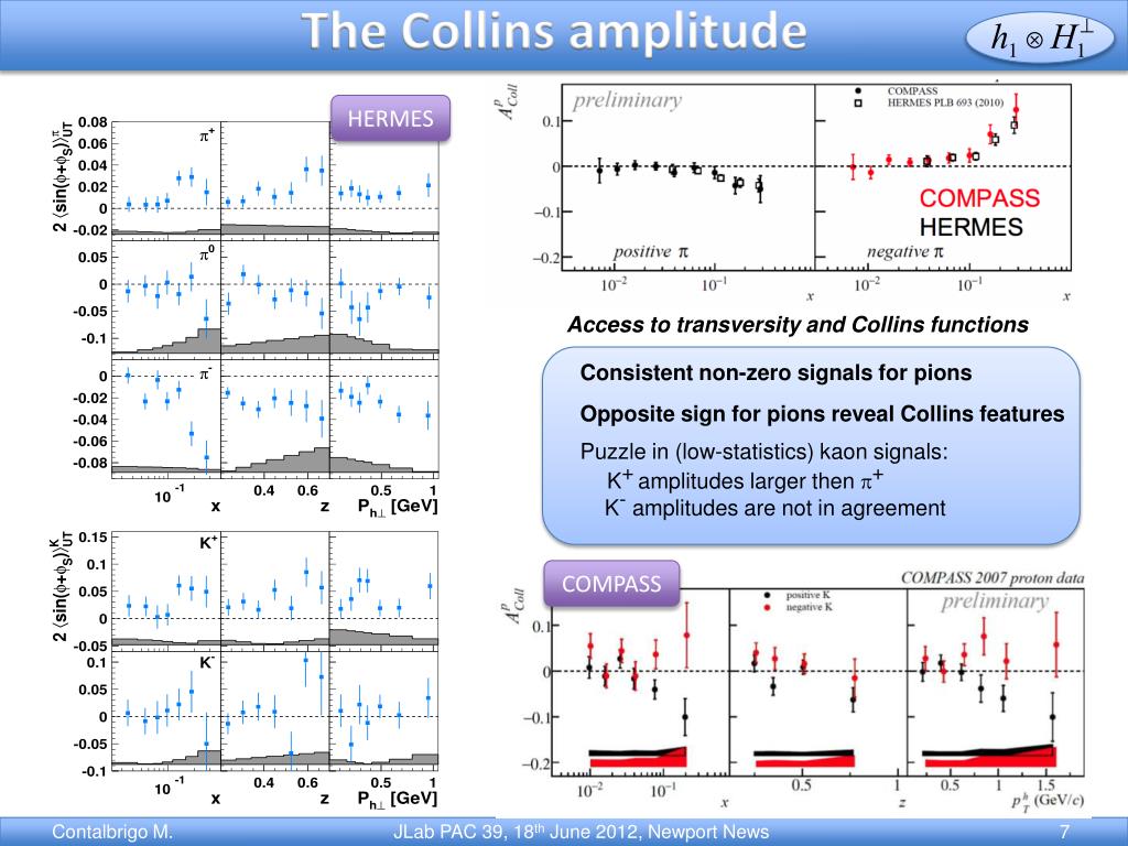 The Collins amplitude HERMES Access to transversity and Collins functions • Consistent non-zero signals for pions • Opposite sign for pions reveal Collins features • Puzzle in (low-statistics) kaon signals: • K+amplitudes larger then p+ • K- amplitudes are not in agreement COMPASS JLab PAC 39, 18th June 2012, Newport News Contalbrigo M. 7