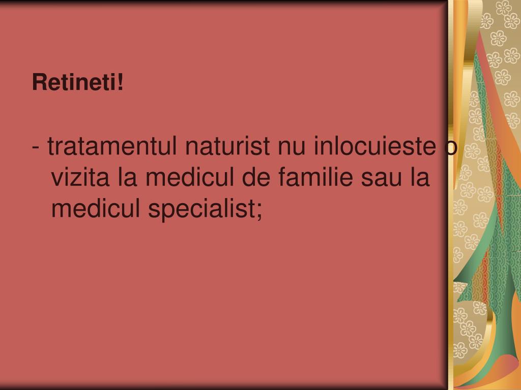 Retineti! - tratamentul naturist nu inlocuieste o vizita la medicul de familie sau la medicul specialist;