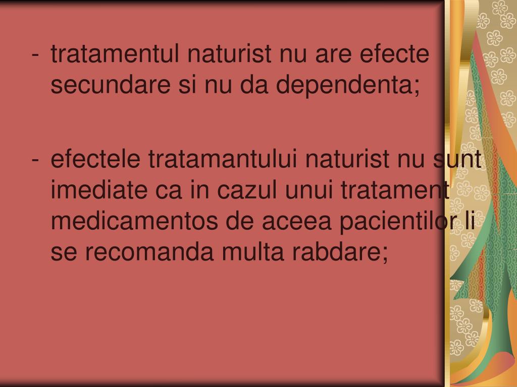 tratamentul naturist nu are efecte secundare si nu da dependenta; • efectele tratamantului naturist nu sunt imediate ca in cazul unui tratament medicamentos de aceea pacientilor li se recomanda multa rabdare;