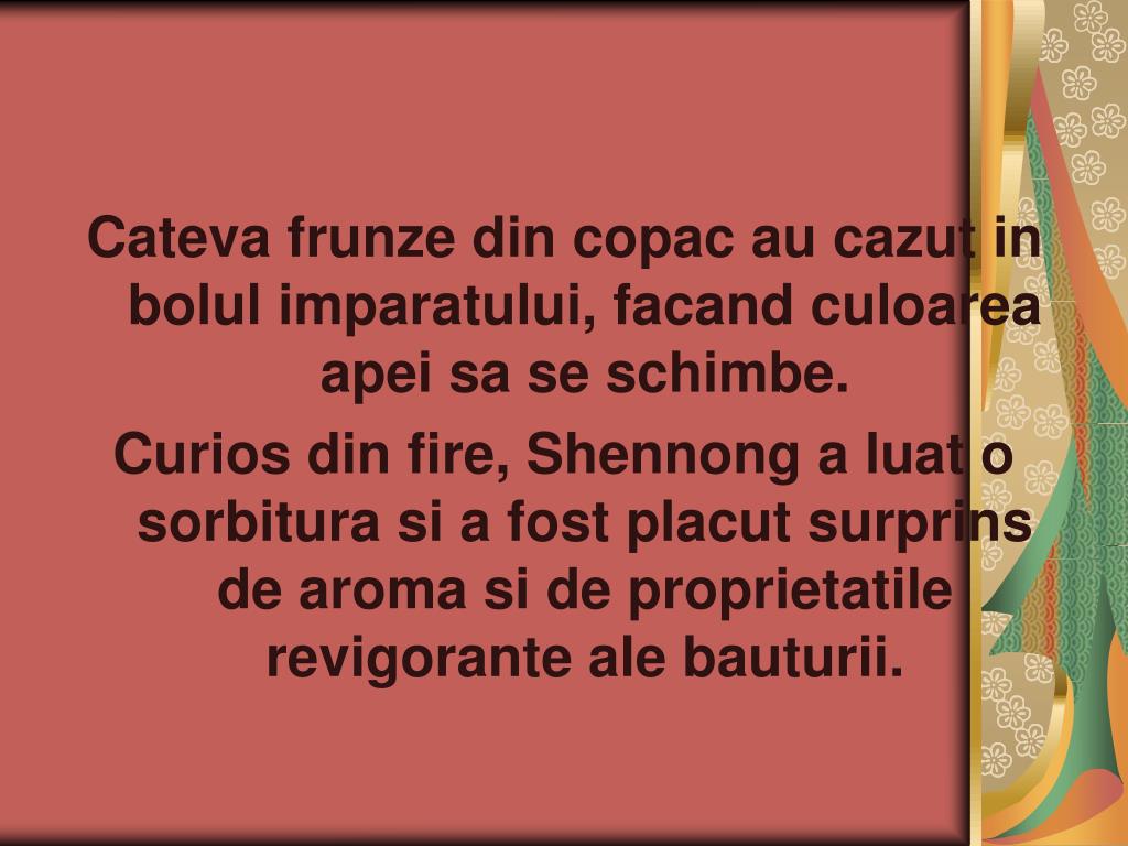 Cateva frunze din copac au cazut in bolul imparatului, facand culoarea apei sa se schimbe. Curios din fire, Shennong a luat o sorbitura si a fost placut surprins de aroma si de proprietatile revigorante ale bauturii.