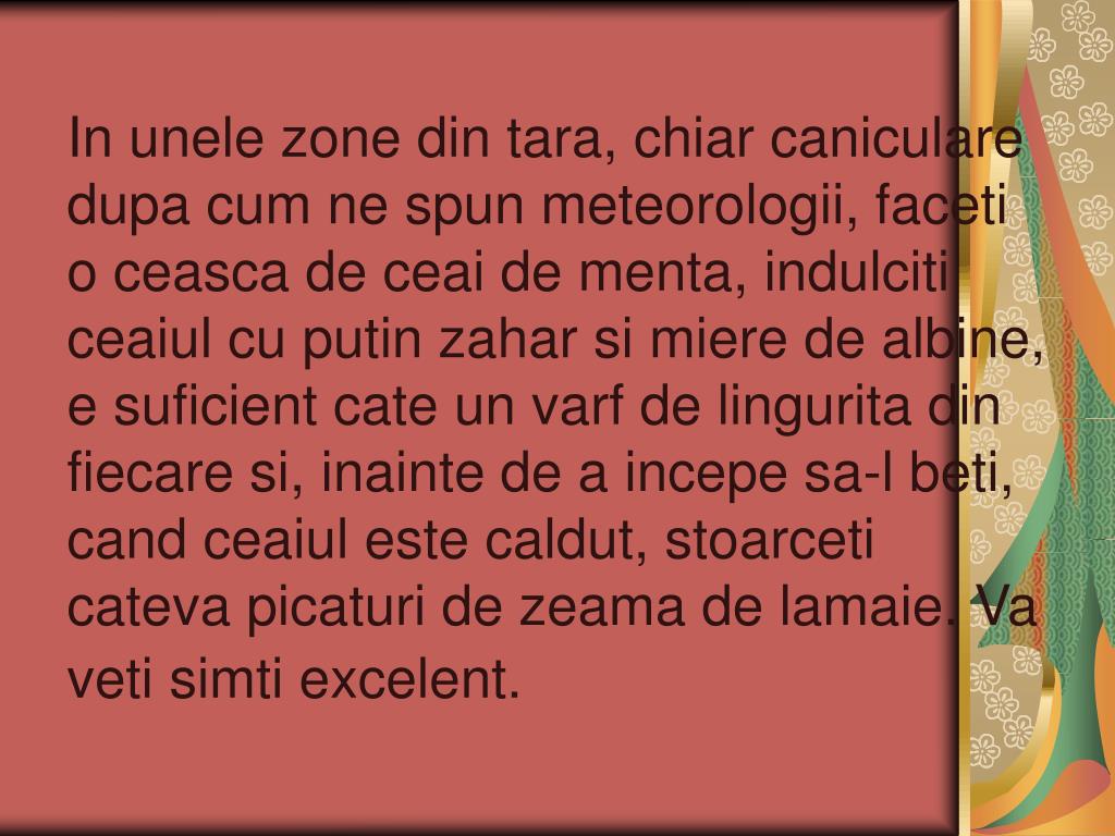 In unele zone din tara, chiar caniculare dupa cum ne spun meteorologii, faceti o ceasca de ceai de menta, indulciti ceaiul cu putin zahar si miere de albine, e suficient cate un varf de lingurita din fiecare si, inainte de a incepe sa-l beti, cand ceaiul este caldut, stoarceti cateva picaturi de zeama de lamaie. Va veti simti excelent.