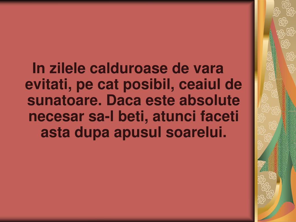 In zilele calduroase de vara evitati, pe cat posibil, ceaiul de sunatoare. Daca este absolute necesar sa-l beti, atunci faceti asta dupa apusul soarelui.