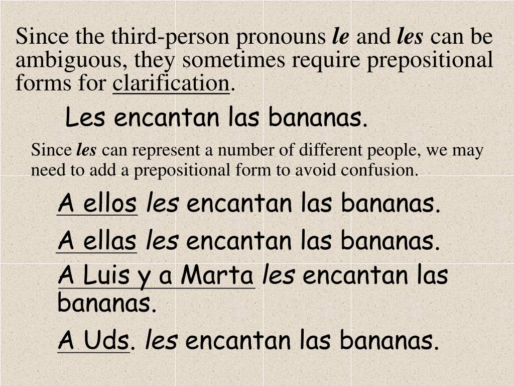 Since the third-person pronouns le and les can be ambiguous, they sometimes require prepositional forms for clarification. Les encantan las bananas. Since les can represent a number of different people, we may need to add a prepositional form to avoid confusion. A ellos les encantan las bananas. A ellas les encantan las bananas. A Luis y a Marta les encantan las bananas. A Uds. les encantan las bananas.