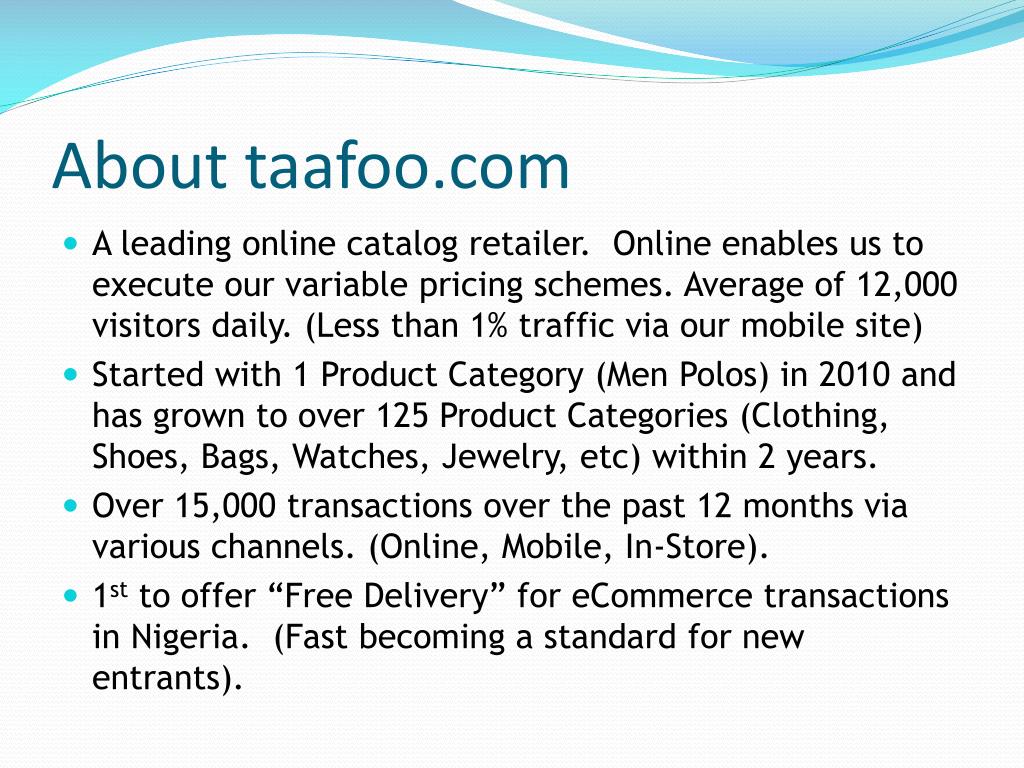 About taafoo.com A leading online catalog retailer. Online enables us to execute our variable pricing schemes. Average of 12,000 visitors daily. (Less than 1% traffic via our mobile site) Started with 1 Product Category (Men Polos) in 2010 and has grown to over 125 Product Categories (Clothing, Shoes, Bags, Watches, Jewelry, etc) within 2 years. Over 15,000 transactions over the past 12 months via various channels. (Online, Mobile, In-Store). 1st to offer “Free Delivery” for eCommerce transactions in Nigeria. (Fast becoming a standard for new entrants).