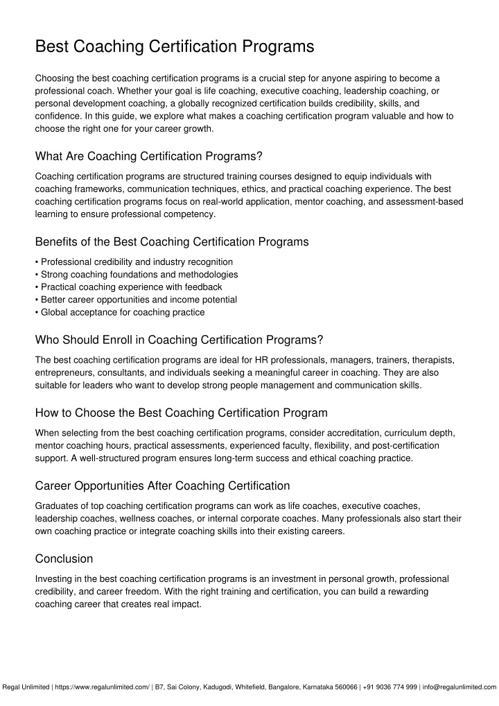 Best Coaching Certification Programs Choosing the best coaching certification programs is a crucial step for anyone aspiring to become a professional coach. Whether your goal is life coaching, executive coaching, leadership coaching, or personal development coaching, a globally recognized certification builds credibility, skills, and confidence. In this guide, we explore what makes a coaching certification program valuable and how to choose the right one for your career growth. What Are Coaching Certification Programs? Coaching certification programs are structured training courses designed to equip individuals with coaching frameworks, communication techniques, ethics, and practical coaching experience. The best coaching certification programs focus on real-world application, mentor coaching, and assessment-based learning to ensure professional competency. Benefits of the Best Coaching Certification Programs • Professional credibility and industry recognition • Strong coaching foundations and methodologies • Practical coaching experience with feedback • Better career opportunities and income potential • Global acceptance for coaching practice Who Should Enroll in Coaching Certification Programs? The best coaching certification programs are ideal for HR professionals, managers, trainers, therapists, entrepreneurs, consultants, and individuals seeking a meaningful career in coaching. They are also suitable for leaders who want to develop strong people management and communication skills. How to Choose the Best Coaching Certification Program When selecting from the best coaching certification programs, consider accreditation, curriculum depth, mentor coaching hours, practical assessments, experienced faculty, flexibility, and post-certification support. A well-structured program ensures long-term success and ethical coaching practice. Career Opportunities After Coaching Certification Graduates of top coaching certification programs can work as life coaches, executive coaches, leadership coaches, wellness coaches, or internal corporate coaches. Many professionals also start their own coaching practice or integrate coaching skills into their existing careers. Conclusion Investing in the best coaching certification programs is an investment in personal growth, professional credibility, and career freedom. With the right training and certification, you can build a rewarding coaching career that creates real impact. Regal Unlimited | https://www.regalunlimited.com/ | B7, Sai Colony, Kadugodi, Whitefield, Bangalore, Karnataka 560066 | +91 9036 774 999 | info@regalunlimited.com