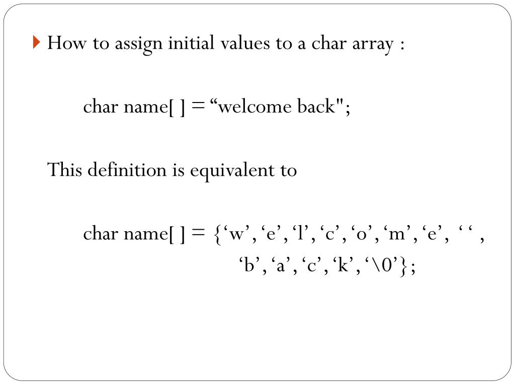 How to assign initial values to a char array : char name[ ] = “welcome back"; This definition is equivalent to char name[ ] = {‘w’, ‘e’, ‘l’, ‘c’, ‘o’, ‘m’, ‘e’, ‘ ‘ , ‘b’, ‘a’, ‘c’, ‘k’, ‘\0’};