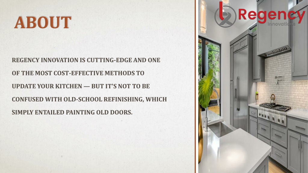 About Regency Innovation is cutting-edge and one of the most cost-effective methods to update your kitchen — but it's not to be confused with old-school refinishing, which simply entailed painting old doors.