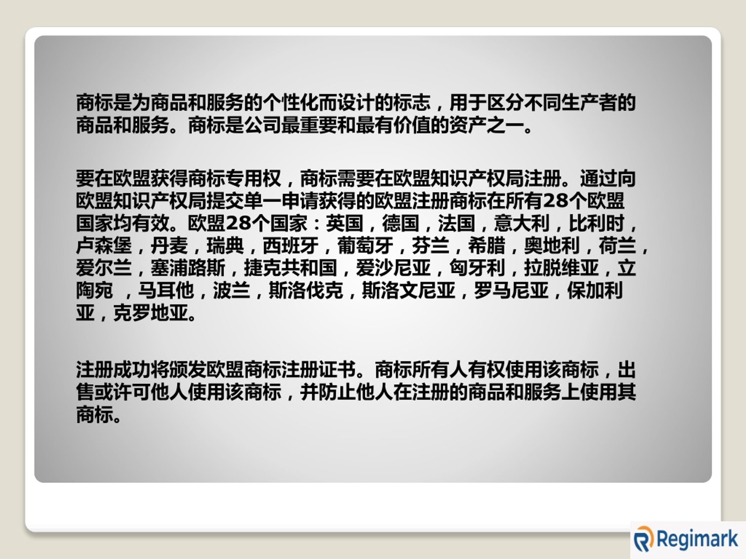 商标是为商品和服务的个性化而设计的标志,用于区分不同生产者的商品和服务。商标是公司最重要和最有价值的资产之一。商标是为商品和服务的个性化而设计的标志,用于区分不同生产者的商品和服务。商标是公司最重要和最有价值的资产之一。 要在欧盟获得商标专用权,商标需要在欧盟知识产权局注册。通过向欧盟知识产权局提交单一申请获得的欧盟注册商标在所有28个欧盟国家均有效。欧盟28个国家:英国,德国,法国,意大利,比利时,卢森堡,丹麦,瑞典,西班牙,葡萄牙,芬兰,希腊,奥地利,荷兰,爱尔兰,塞浦路斯,捷克共和国,爱沙尼亚,匈牙利,拉脱维亚,立陶宛 ,马耳他,波兰,斯洛伐克,斯洛文尼亚,罗马尼亚,保加利亚,克罗地亚。 注册成功将颁发欧盟商标注册证书。商标所有人有权使用该商标,出售或许可他人使用该商标,并防止他人在注册的商品和服务上使用其商标。