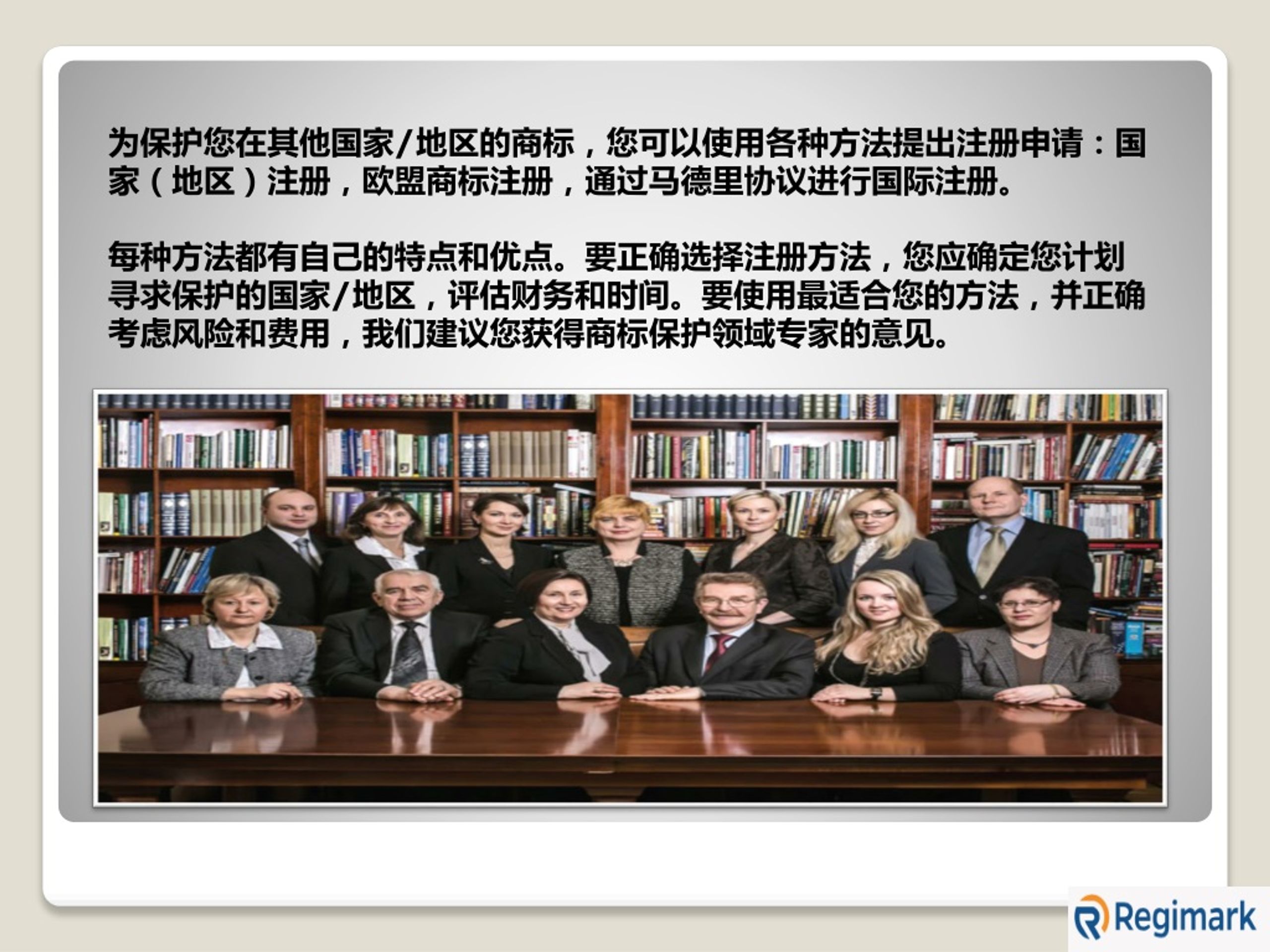 为保护您在其他国家/地区的商标,您可以使用各种方法提出注册申请:国家(地区)注册,欧盟商标注册,通过马德里协议进行国际注册。每种方法都有自己的特点和优点。要正确选择注册方法,您应确定您计划寻求保护的国家/地区,评估财务和时间。要使用最适合您的方法,并正确考虑风险和费用,我们建议您获得商标保护领域专家的意见。为保护您在其他国家/地区的商标,您可以使用各种方法提出注册申请:国家(地区)注册,欧盟商标注册,通过马德里协议进行国际注册。每种方法都有自己的特点和优点。要正确选择注册方法,您应确定您计划寻求保护的国家/地区,评估财务和时间。要使用最适合您的方法,并正确考虑风险和费用,我们建议您获得商标保护领域专家的意见。